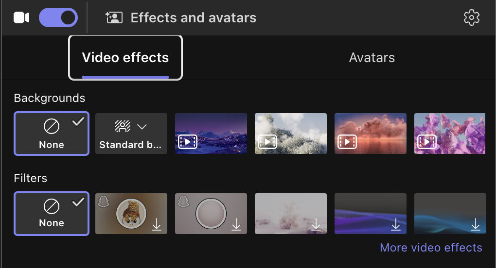 1. Fondos y filtros: en los ajustes de Efectos y avatares , selecciona Ninguno en Fondos y Filtros para evitar que se apliquen efectos no deseados a la transmisión de la cámara virtual de Airtime.