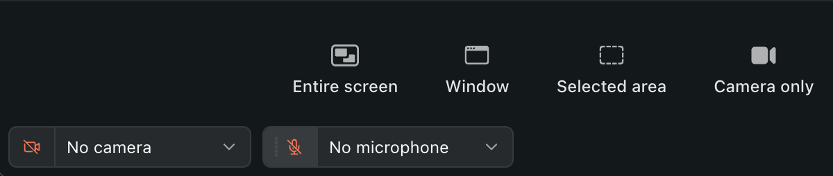 💡 Consejo: Puedes verificar el estado tanto de tu cámara como de tu micrófono en la barra de herramientas de Airtime Recorder antes de comenzar. Si aparece el mensaje “Sin cámara” o “Sin micrófono” en rojo, significa que están desactivados.